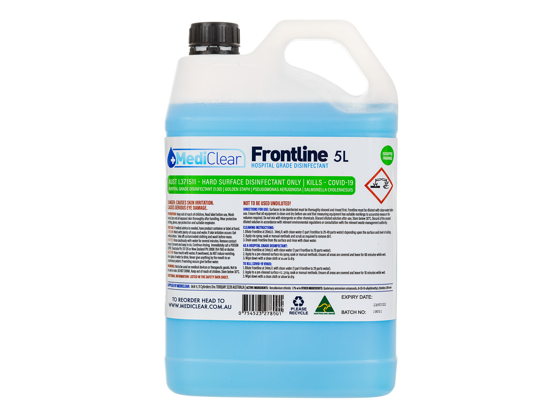 MEDICLEAR Frontline Multi-Purpose Cleaner & Surface Sanitiser is a hospital-grade disinfectant specifically formulated to tackle tough cleaning tasks while effectively sanitising surfaces. Proven to kill COVID-19, it is versatile enough for a wide range of applications, from floors to bathrooms and glass surfaces. Available in 5L, 25L, and 1000L sizes, it’s the ideal solution for both small and large-scale cleaning operations.