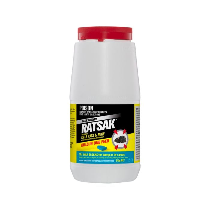 The fast-acting active ingredient in the bait kills rats and mice in a single feed. RATSAK Fast Action Wax Blocks come in a 540g pack size that contains 36 Wax Blocks.